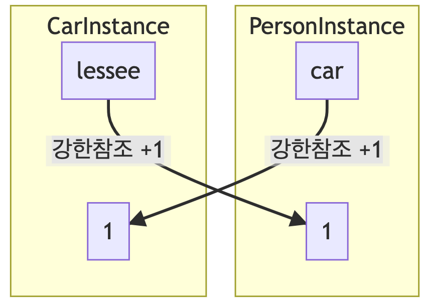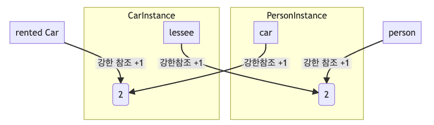 person과 rentedCar는 각각의 Person, Car 인스턴스에 강한 참조로 연결 된다. 이 시점에 각각 참조카운트는 1이다.
