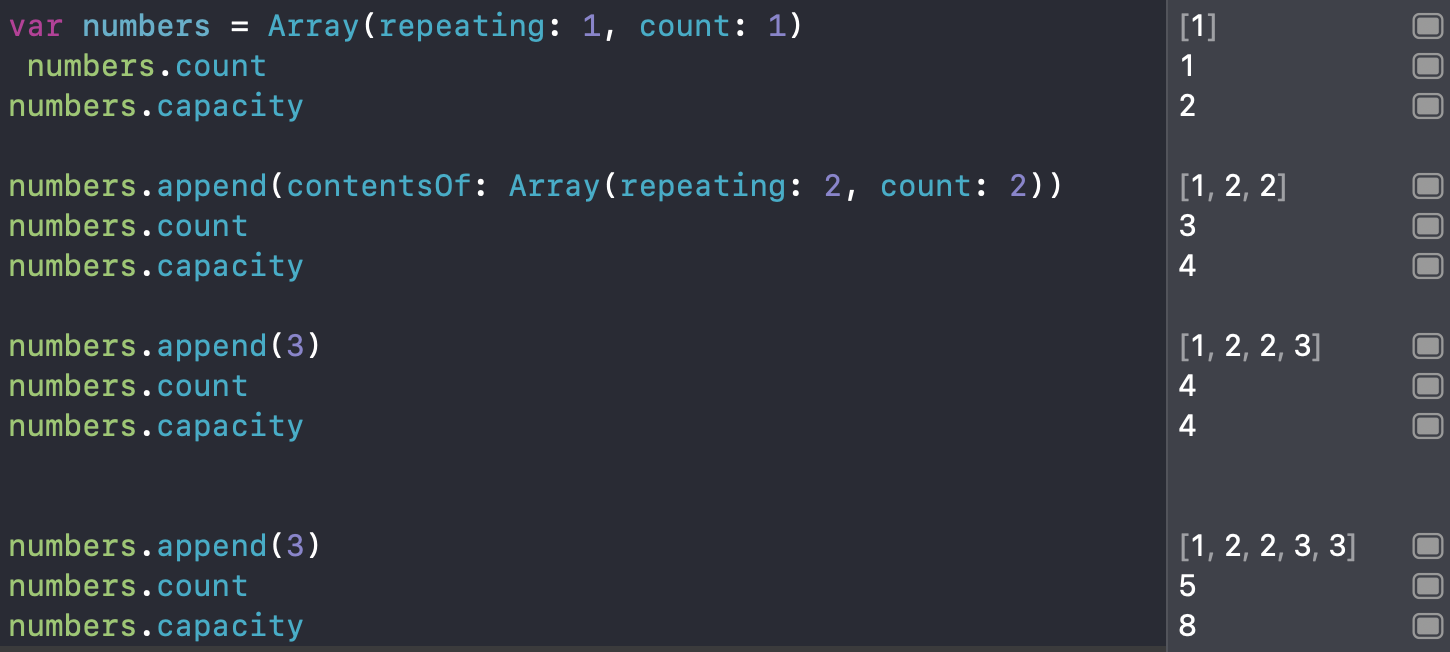 왜냐면 Swift에서 배열은 amortized constant-time 란 걸 달성하기 위해 기하학적 할당 패턴 즉 위에서 설명했던 두배로 용량을 늘리는 방법을 사용하는데요!