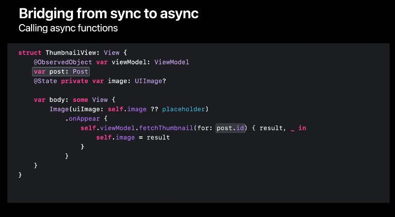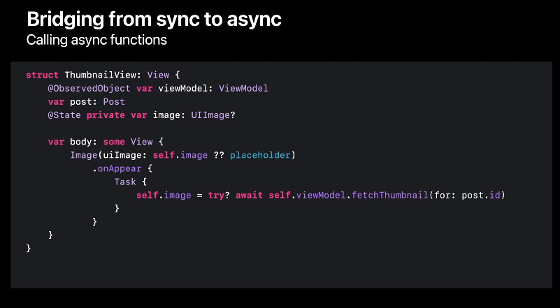 SwiftUI의 `onAppear` 와 같은 not asynchronous한 클로저에서 비동기 메서드를 사용할 땐 Task 블럭으로 감싸줘야 합니다.