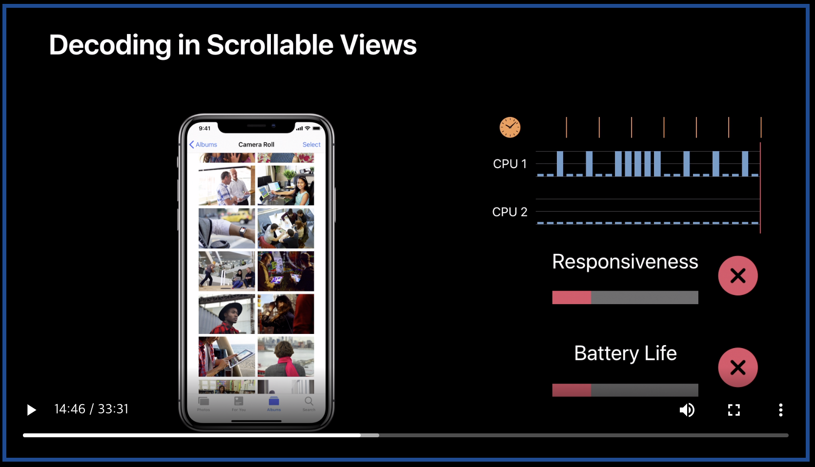 그리고 셀을 보여줄 때마다 CPU1 사용량이 스파이크가 튀는 걸 확인할 수 있는데 이런 동작은 응답성뿐만 아니라 배터리 지속 시간에도 악영향을 준다. 왜냐하면 iOS는 CPU 수요가 원할하게 지속될 때 배터리의 전력 수요를 관리하는 데에 탁월하기 때문이다.