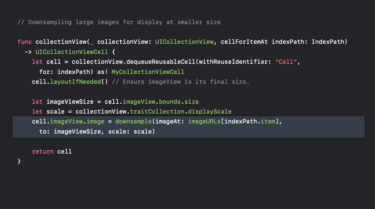 이미지 소스를 설정하고 축소 이미지(썸네일)를 만든 다음 디코딩된 이미지 버퍼를 UIImage로 캡처 후 해당 이미지를 이미지뷰에 할당한다.
