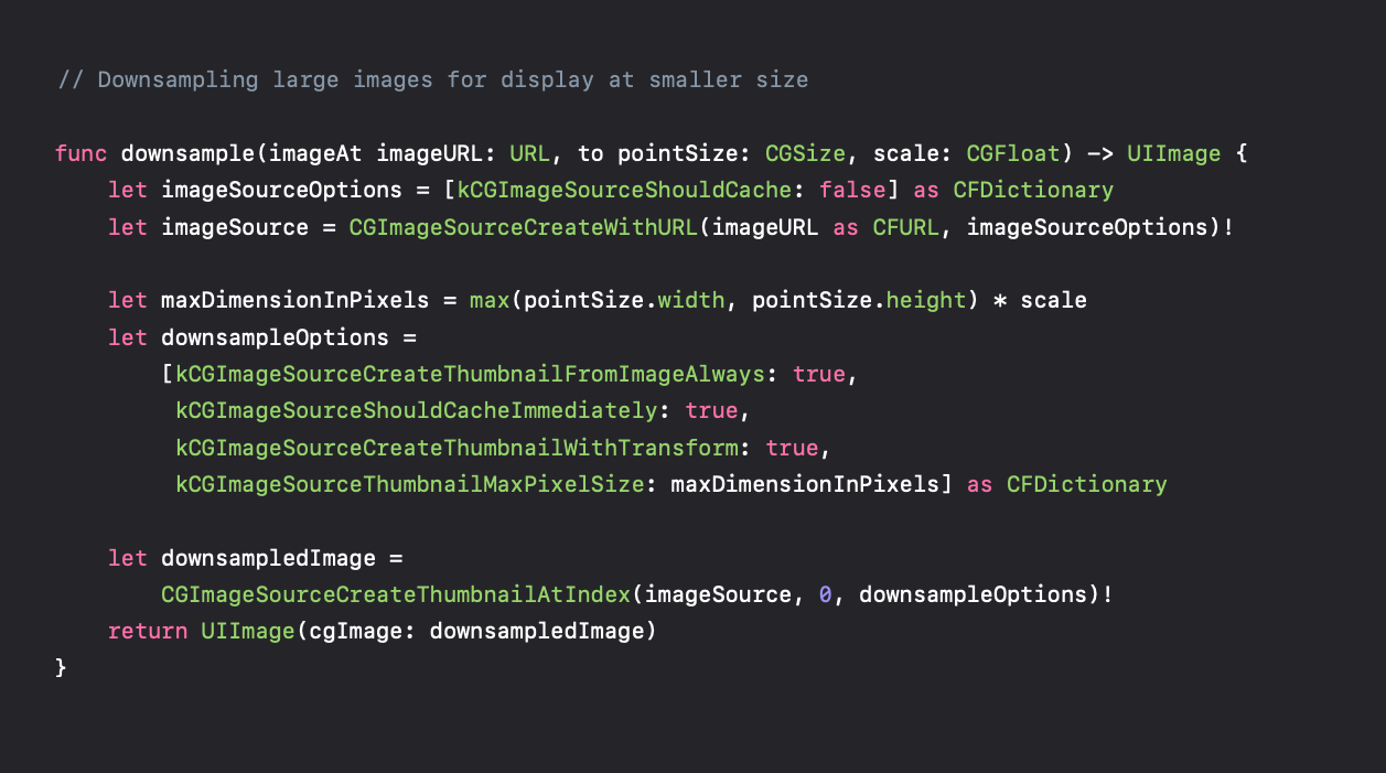 `CacheImmediately` : 썸네일을 작성하도록 요청할 때 디코딩된 이미지 버퍼를 생성해야하는 정확한 시점을 Core Graphics에 전달하는 것. 기본값은 kCFBooleanFalse이며 이미지를 렌더링할 때만 디코딩 및 캐싱이 발생